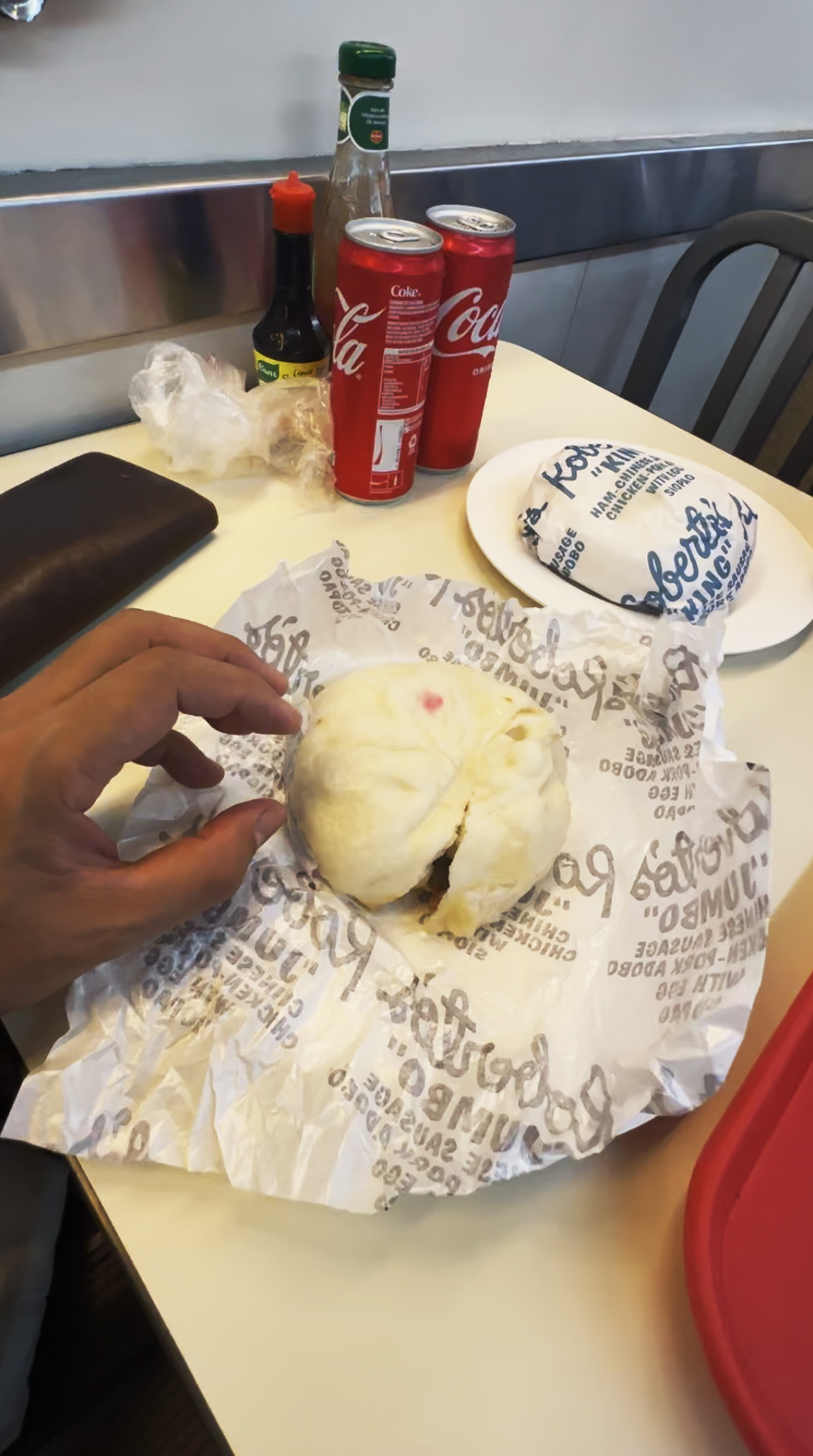 - There are four types of siopao: the ₱180 Queen, ₱150 King, ₱100 Jumbo and ₱60 Regular. Aside from the size (e.g. the Queen is the biggest, at least they’re not patriarchal), the fillings also vary. The Queen, for instance, has bacon, Chinese sausage, chicken-pork adobo, and egg; while, for the King, remove the bacon). Yes, the siopaos we got were bigger-than-usual. And the dough used was soft. But, taste-wise, they were… not exactly memorable. Malaki and malaman but unremarkable.